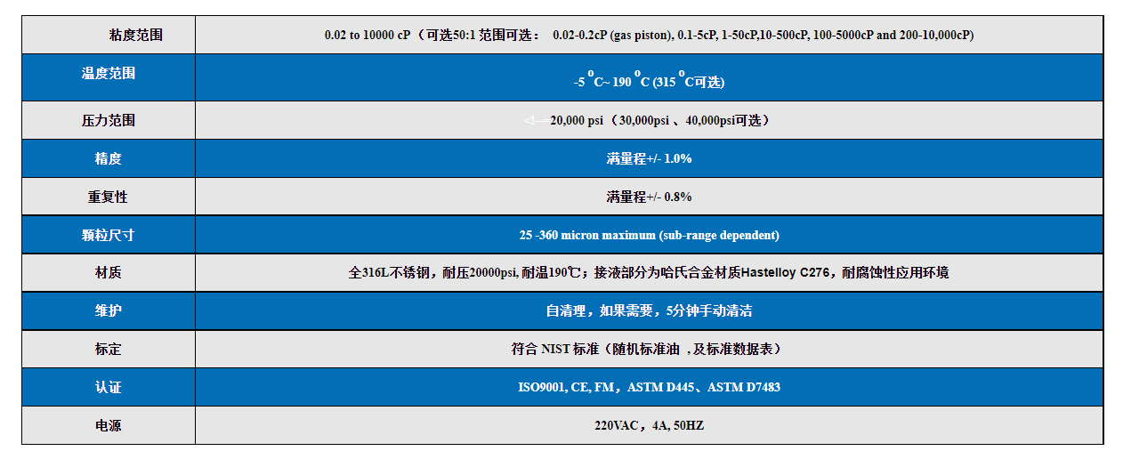 1.高溫高壓粘度計(VISCOlab PVT+):劍橋粘度公司的ViscoLab PVT+(壓力-體積-溫度)是在高溫和高壓下測定粘度的全球實驗室標準。ViscoLab PVT+高壓粘度計設計用于儲層流體分析、相態行為、超臨界流體和其他研發應用中的粘度和溫度測試。